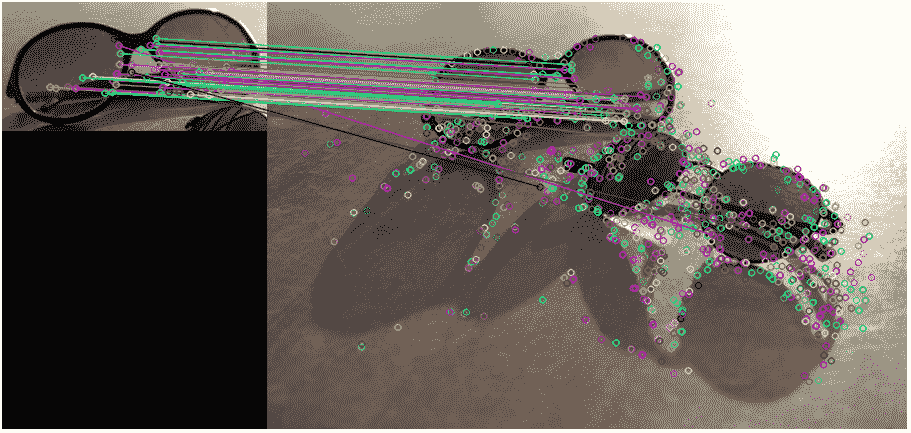 现在,颜色更适合我们在这里使用的颜色。 还应注意一些很不正常的不正确匹配,可以通过修改 KAZE 算法的参数甚至使用其他算法来解决。 现在让我们看看如何解释匹配结果。