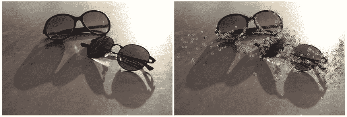 我们在引言段落中刚刚描述的内容也是创建许多用于相同目的的计算机视觉算法的基础。 在本章中,您将学习 OpenCV 框架中一些最重要的类和方法,这使我们能够在图像(或图像中的对象)中找到称为特征(或关键点)的可区分片段。 然后,我们将继续学习描述符,顾名思义,这些描述符是对找到的特征的描述。 因此,我们将学习如何检测图像中的特征,然后从特征中提取描述符。 这些描述符然后可以在计算机视觉应用中用于许多目的,包括两个图像的比较,单应性变化检测,在图像内部定位已知对象等等。 重要的是要注意,保存,处理图像的特征和描述符并基本上执行任何操作通常比尝试使用图像本身更快,更容易,因为特征和描述符只是一堆数值,尝试以一种或另一种方式描述图像,具体取决于用于检测特征和提取描述符的算法。