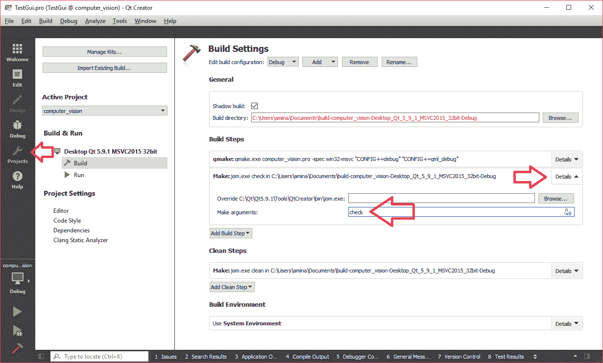 1. 最后,您需要在 Qt Creator 中切换到项目模式,并将检查添加到Make arguments字段中,如以下屏幕截图所示。 确保首先使用“详细信息”扩展器按钮扩展“制作”部分; 否则,它将不可见: