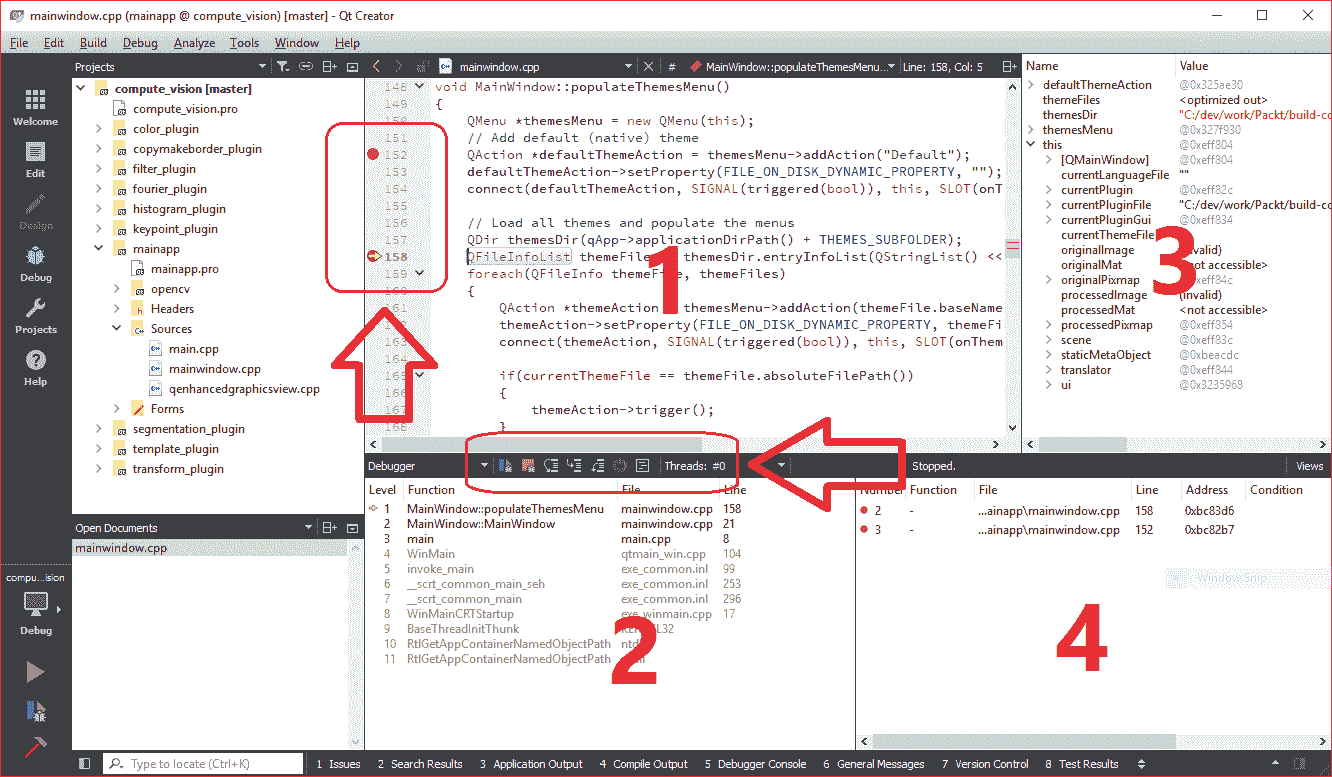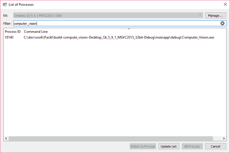请注意,可以通过多种方式来启动调试过程,例如通过将其附加到在另一台计算机上运行的过程中来远程启动。 但是,上述方法在大多数情况下就足够了,尤其是与 Qt + OpenCV 应用开发以及我们在本书中学到的内容有关的情况。