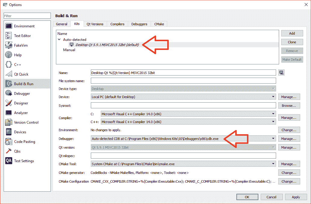 根据操作系统和已安装的调试器的不同,前面的屏幕快照可能会略有不同。 但是,您将需要一个调试器,以确保已正确设置为所用 Qt Kit 的调试器。 因此,记下调试器的路径和名称,并切换到 Kits 选项卡,然后在选择了所用的 Qt Kit 后,请确保正确设置了调试器,如以下屏幕快照所示:
