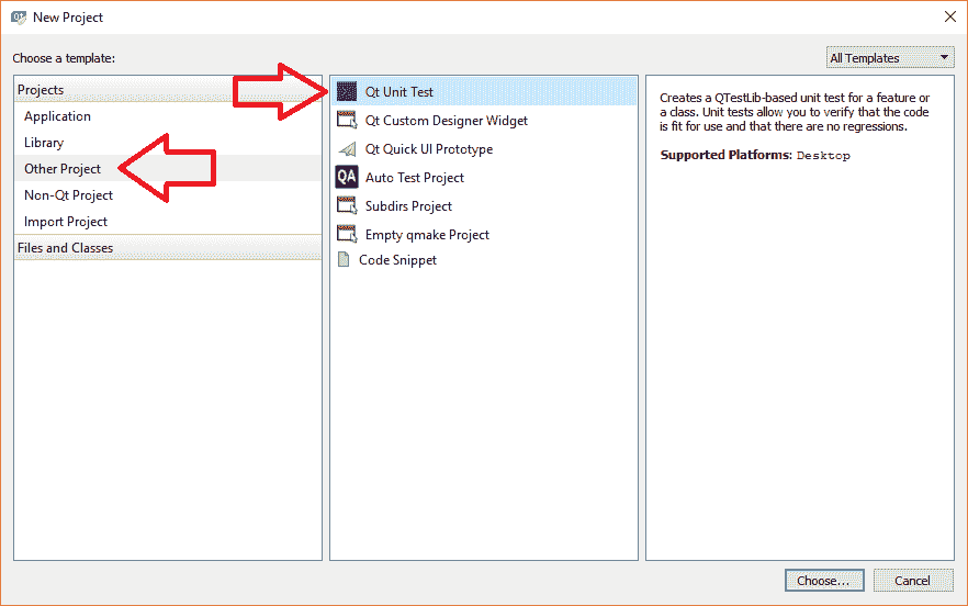 1. 可以使用 Qt Creator 创建单元测试,类似于创建 Qt 应用或库,也可以在“欢迎”模式下使用“新建项目”按钮,或者从“文件”菜单中选择“新建文件”或“项目”来创建单元测试。 确保选择以下内容作为项目模板: