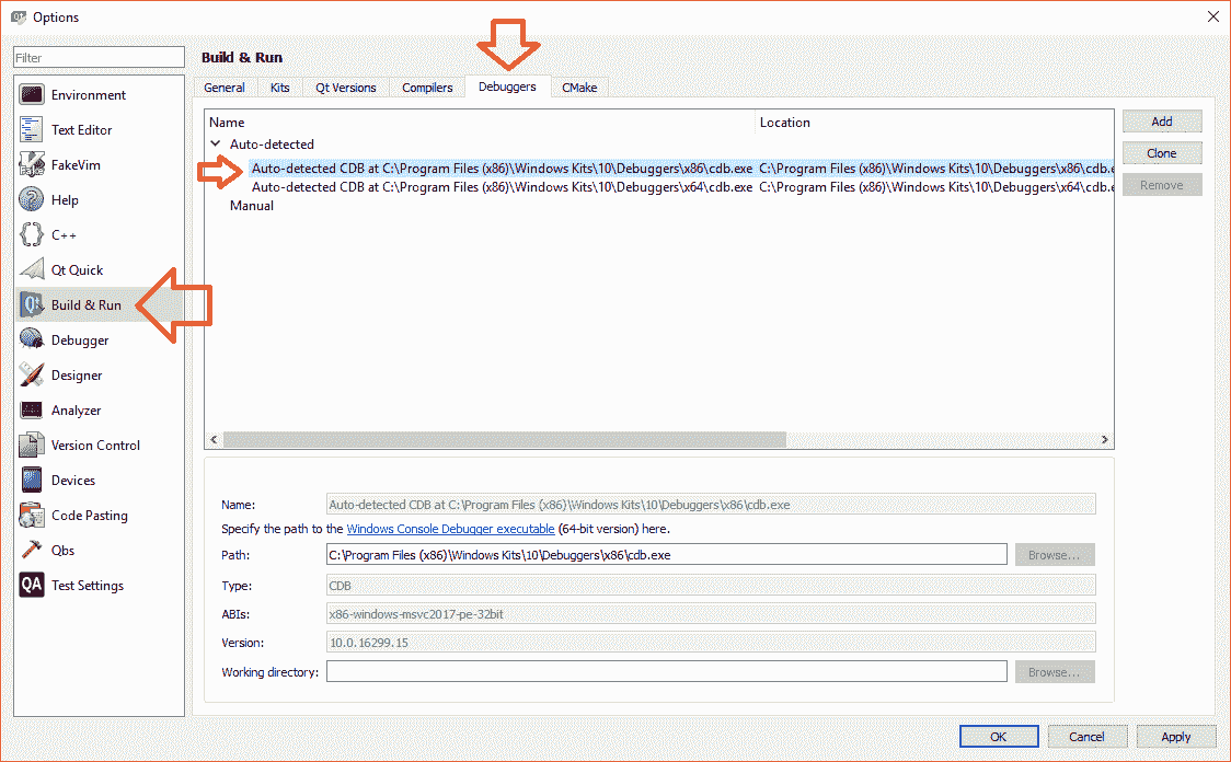但是,在安装调试器之后(假定是 Microsoft Visual C++ 编译器的 CDB 或 Microsoft 控制台调试器,以及 GCC 编译器的 GDB),您可以重新启动 Qt Creator 并返回此页面。 您应该可以具有一个或多个类似于以下内容的条目。 由于我们已经安装了 32 位版本的 Qt 和 OpenCV 框架,因此选择名称中带有 x86 的条目以查看其路径,类型和其他属性。