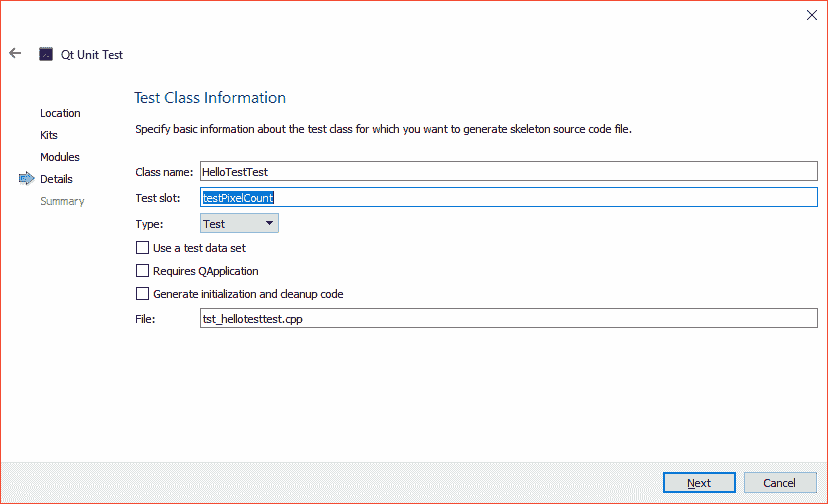1. 选择模块并单击下一步后,将显示“详细信息”页面或“测试类别信息”页面。 在以下屏幕截图中看到的“测试插槽”字段中输入testPixelCount,然后单击“下一步”。 其余选项(如前一个窗口)只是简单的帮助程序,可轻松地以交互方式添加所需的函数,并包括对测试单元的指令,如果缺少任何内容,也可以稍后在源文件中添加这些指令。 不过,本章稍后将了解它们的含义以及如何使用它们。