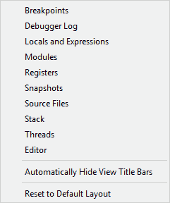 您也可以右键单击包含调试器控件的代码编辑器下方的同一工具栏,以打开以下菜单,并添加或删除更多窗格以显示其他调试和分析信息。 我们将介绍默认的调试器视图,但请确保自行检查以下每个选项,以进一步熟悉调试器: