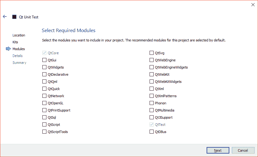 3. 在下一个屏幕截图中看到的“模块”页面中,您会注意到 QtCore 和 QtTest 模块是默认选择的,不能取消选择它们。 该页面只是一个帮助程序,或者是一个帮助您以交互方式选择所需模块的所谓向导。 如果忘记了添加类正常工作所需的模块,则以后也可以使用项目*.pro文件添加或删除模块。 这使得有必要再次重复一个重要的观点。 单元测试就像使用您的类和函数的应用一样。 唯一的区别是,您仅将其用于测试目的,并且仅用于确保事情按预期运行,并且没有回归:
