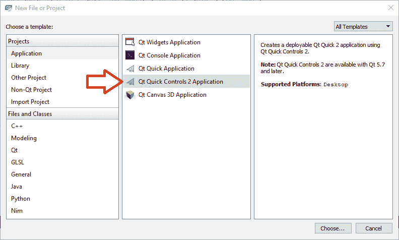 让我们通过创建一个示例应用来解决这个问题。 首先打开 Qt Creator,然后在欢迎屏幕上按“新建项目”按钮,或者从“文件”菜单中选择“新建文件”或“项目”。 选择“Qt Quick Controls 2 应用”作为模板类型,然后按“选择”,如以下屏幕截图所示: