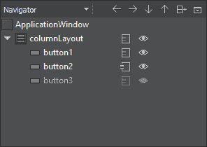 “库”窗格的正下方是“导航器”窗格,它在用户界面上显示组件的层次结构视图。 您可以使用“导航器”窗格,只需双击它们即可快速设置 QML 文件中的项目 ID。 此外,您可以将项目导出为别名,以便可以在其他 QML 文件中使用它,也可以在设计时将其隐藏(以便查看重叠的 QML 项目)。 在“导航器”窗格上的以下屏幕快照中,请注意在将button2导出为别名并将button3在设计期间隐藏之后,组件旁边的小图标是如何变化的: