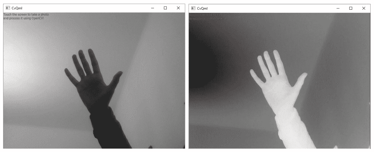 text: "Touch the screen to take a photo<br>and process it using OpenCV!"