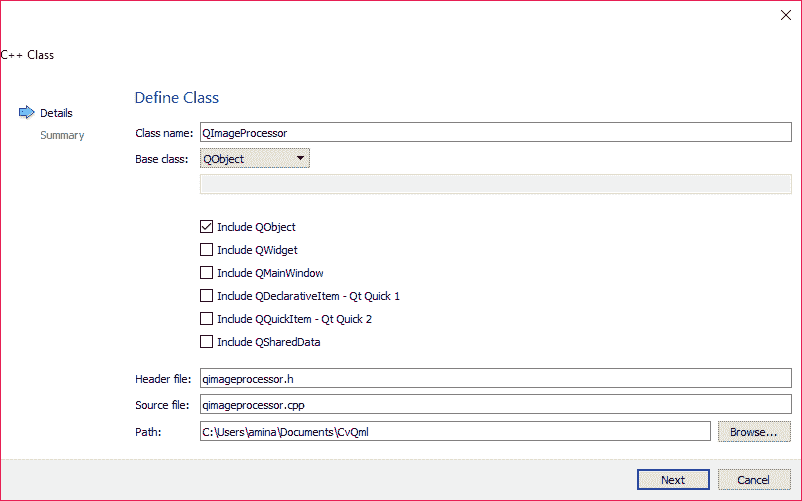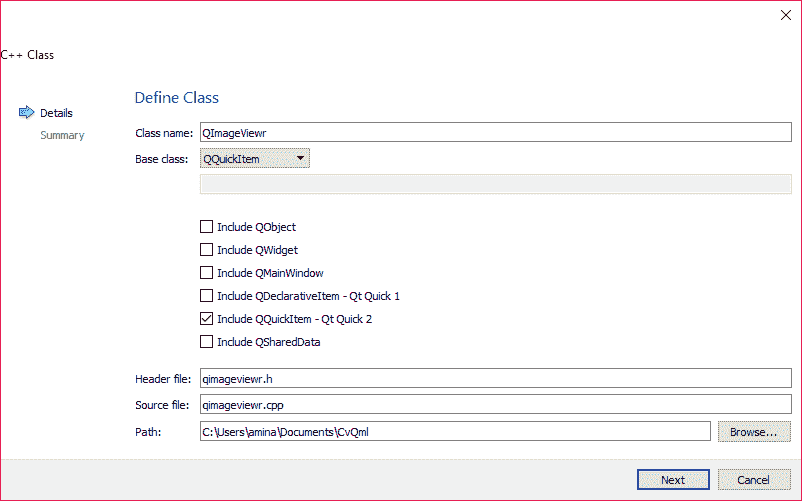 我们的图像处理器现已完成。 现在,我们需要创建一个 Visual C++ 类型,该类型可在 QML 中用于显示QImage对象。 因此,创建另一个类并将其命名为QImageViewer,但这一次请确保它是QQuickItem子类,如以下新类向导屏幕截图所示: