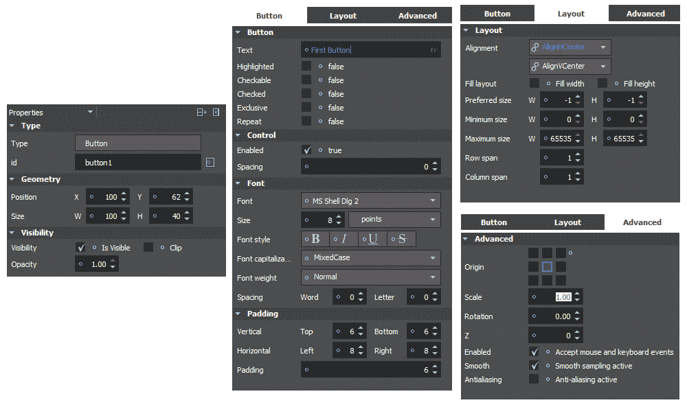 在 Qt Quick 设计器的右侧,您可以找到“属性”窗格。 与标准 Qt 设计模式下的“属性”窗格相似,此窗格可用于详细操作和修改 QML 项的属性。 该窗格的内容根据用户界面上的选定项目而变化。 除了 QML 项目的标准属性外,此窗格还允许修改与单个项目的布局有关的属性。 以下屏幕快照描绘了在用户界面上选择“按钮”项时“属性”窗格的不同视图: