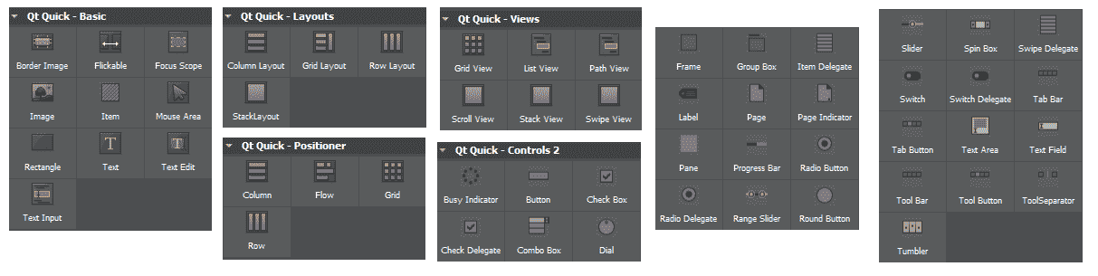 在“Qt Quick 设计器”屏幕的左侧,您可以在“库”窗格中看到可以添加到用户界面的 QML 类型的库。 它与 Qt Widgets 工具箱类似,但肯定有更多组件可用于设计应用的用户界面。 您只需在用户界面上拖放它们中的每一个,它们就会自动添加到您的 QML 文件中: