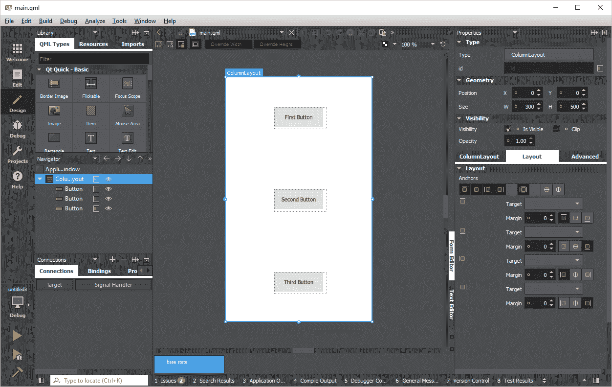 现在,您可以将 QML 用户界面元素作为子项添加到布局中,并由其自动管理。 让我们在ColumnLayout中添加一些按钮,看看如何完成此操作:
