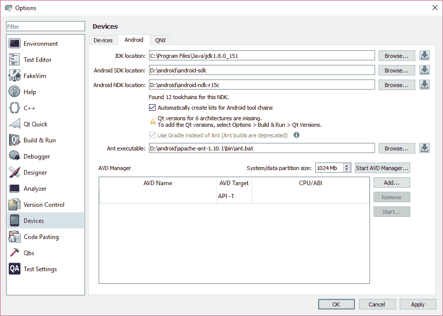 - 对于 Android,您必须确保在计算机上安装 JDK,Android SDK,Android NDK 和 Apache Ant。 如果使用 Qt Creator 选项内“设备”页面中的 Android 选项卡,将所需的程序下载并安装到计算机上,则 Qt Creator 可以简化 Android 开发环境的配置(请参见以下屏幕截图):