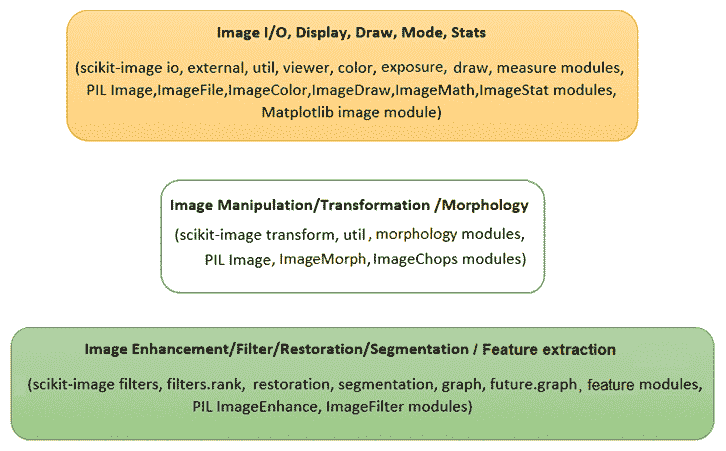 在本书中,我们将使用一些 Python 包来处理图像。首先,我们将使用一组库来进行经典的图像处理:从提取图像数据开始,使用一些算法转换数据,使用库函数进行预处理、增强、恢复、表示(使用描述符)、分割、分类、检测和识别(对象)以进行分析、理解,并更好地解释数据。接下来,我们将使用另一组库来进行基于深度学习的图像处理,这是一种在过去几年中非常流行的技术。