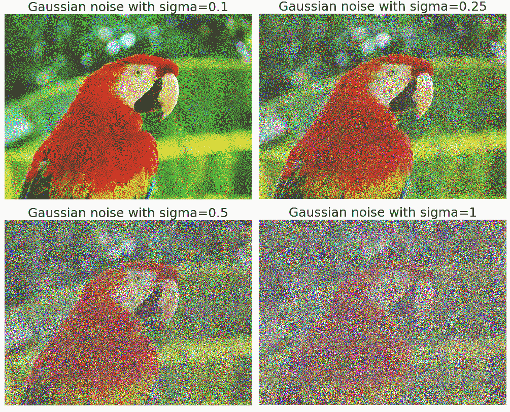 下一个图显示了通过运行前面的代码片段添加具有不同方差的高斯噪声生成的输出图像。可以看出,高斯噪声的标准偏差越大,输出图像的噪声越大: