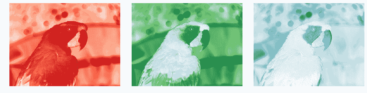 下图显示了通过运行前面的代码为每个 R(红色)、G(绿色)和 B(蓝色)通道创建的三个输出图像: