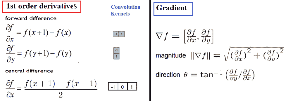 下图显示了如何使用有限差分(具有正向和中心差分,后者更精确)计算图像I(这是一个函数f(x,y))的偏导数,可以使用卷积和所示的内核来实现。该图还定义了梯度向量、其大小(对应于边的强度)和方向(垂直于边)。输入图像中强度(灰度值)急剧变化的位置对应于图像一阶导数强度中存在峰值/尖峰(或低谷)的位置。换句话说,梯度幅值中的峰值标记边缘位置,我们需要对梯度幅值设置阈值,以在图像中找到边缘: