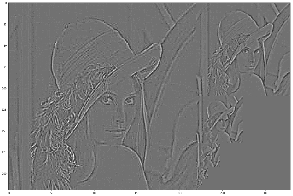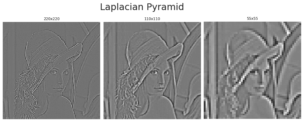 用于计算拉普拉斯金字塔的代码类似于先前用于计算高斯金字塔的代码;这是留给读者的练习。以下屏幕截图显示了lena灰度图像的拉普拉斯金字塔: