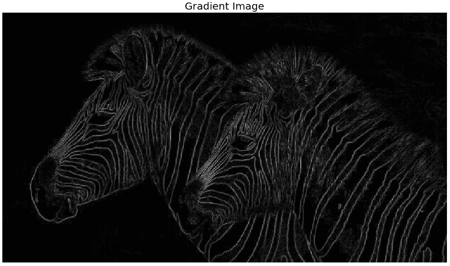 如前所述,使用偏导数的(正向)有限差分近似计算的梯度幅度(可以认为是边缘强度)可用于边缘检测。下面的屏幕截图显示了通过使用与上次相同的代码来计算梯度大小,然后使用斑马输入的灰度图像以[0,1]间隔剪裁像素值而获得的输出: