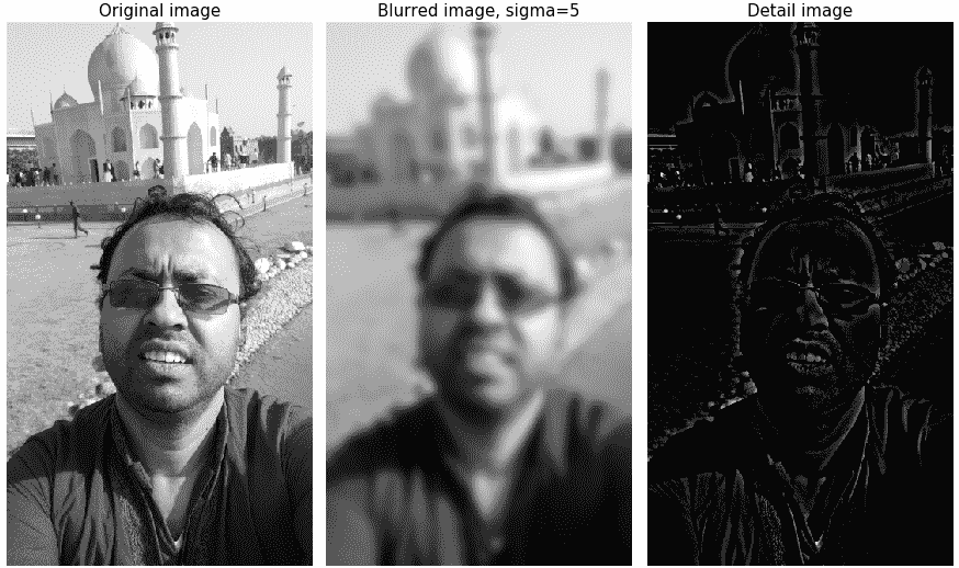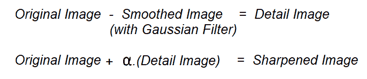 如前所述,我们可以首先模糊图像,然后计算细节图像作为原始图像和模糊图像之间的差值,以实现反锐化掩蔽。锐化后的图像可以作为原始图像和细节图像的线性组合来计算。下图再次说明了该概念: