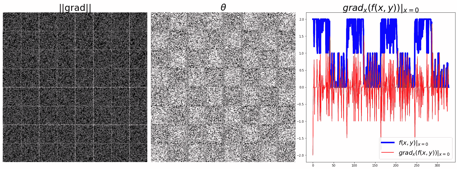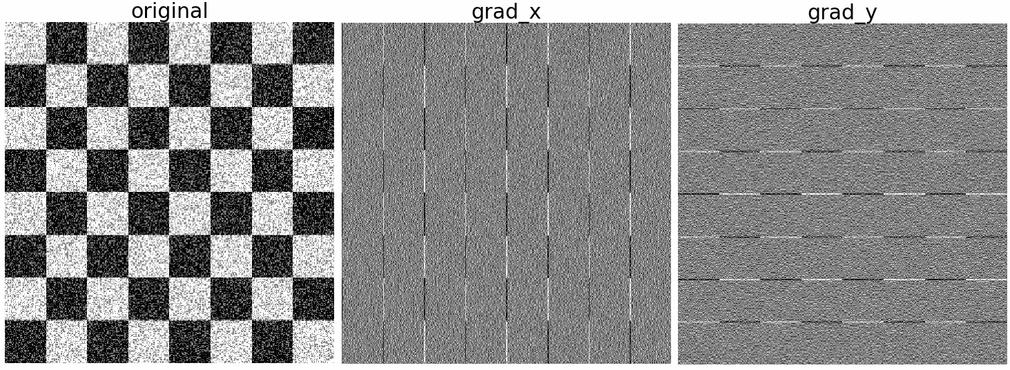 下图显示了在向象棋图像添加一些随机噪声后上一个代码块的输出。如我们所见,向输入图像添加随机噪声对(偏)导数和梯度幅度有很大影响;与边缘相对应的峰值与噪声几乎无法区分,并且图案被破坏: