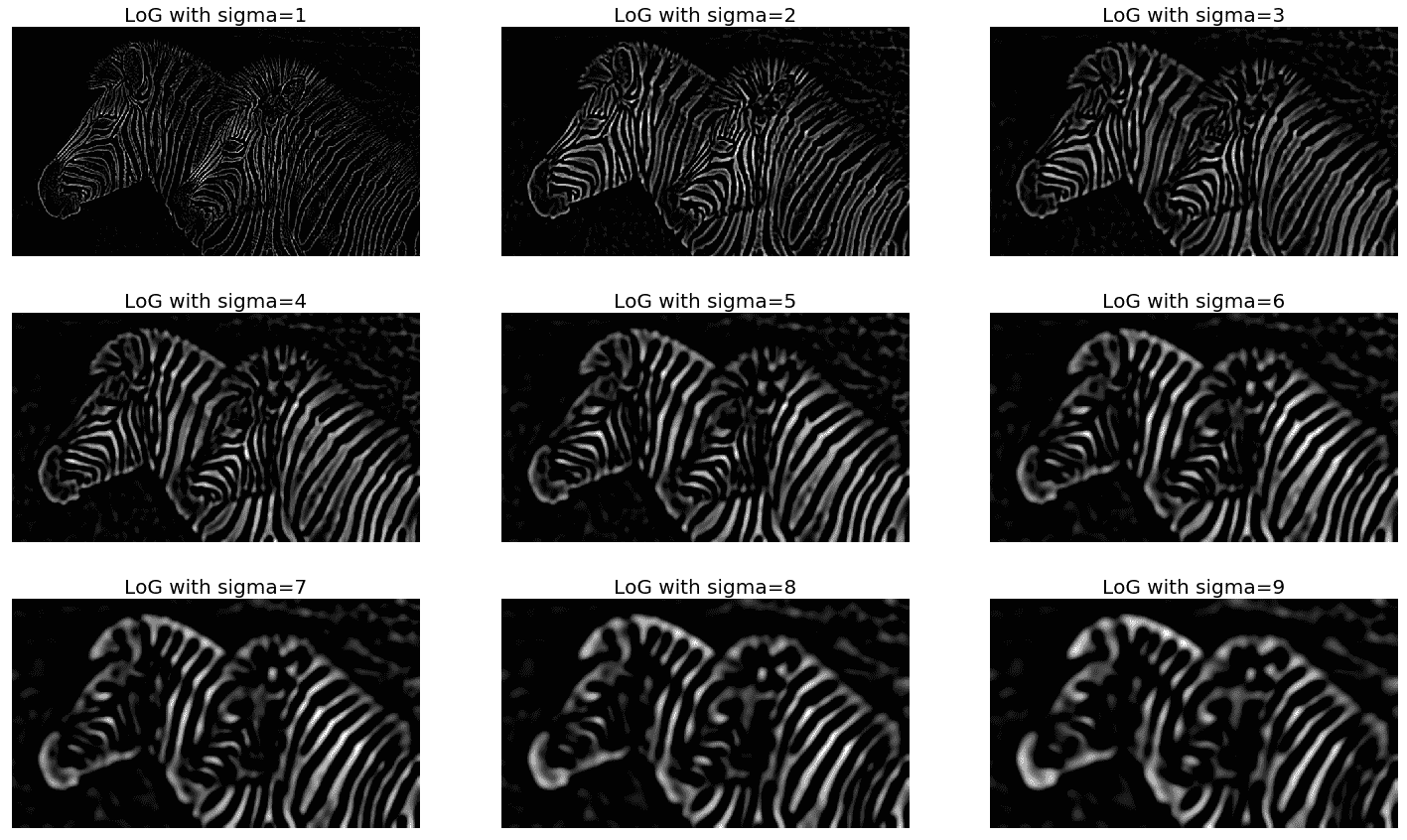 以下图像显示了使用具有不同平滑参数σ(高斯滤波器的标准偏差)值的对数滤波器获得的输入图像和输出图像: