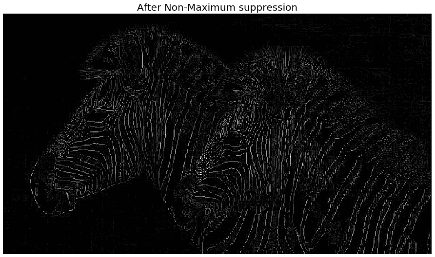 为了获得每一个边缘都有一个像素宽的二值图像,我们需要应用非最大值抑制算法,如果像素不是像素邻域中沿梯度方向的局部最大值,则移除该像素。算法的实现留给读者作为练习。以下屏幕截图显示了带有非最大抑制的输出: