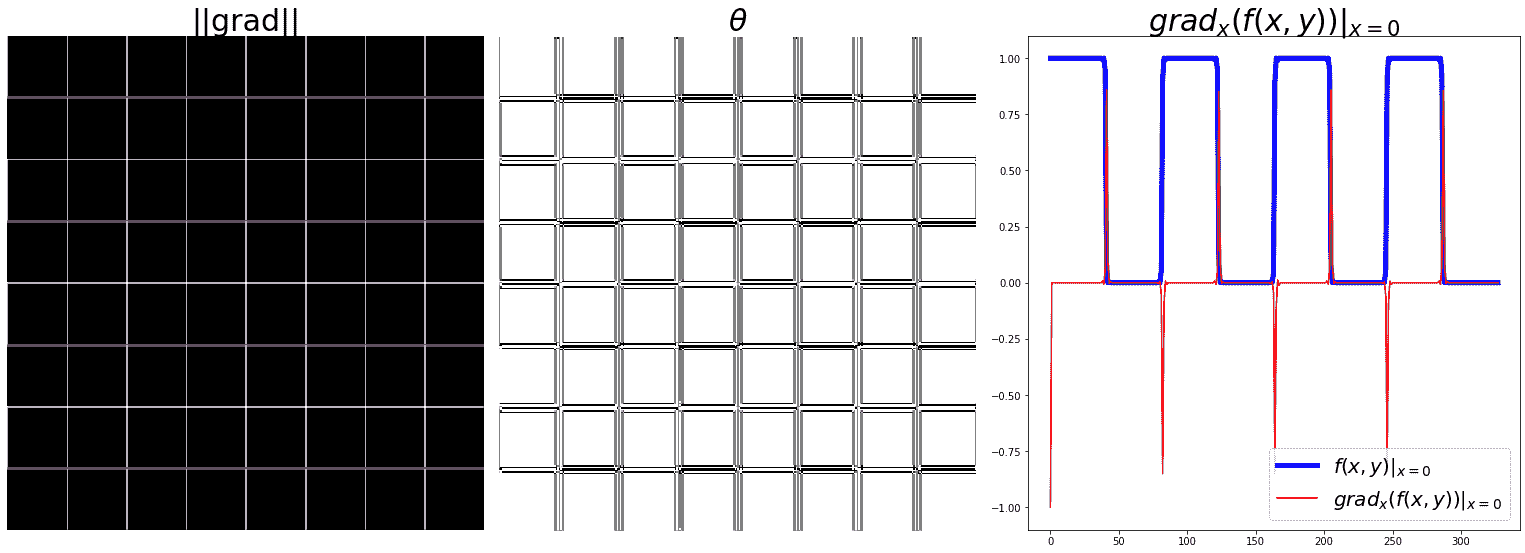 下图显示了前面代码块的输出。从下图可以看出,x 和 y 方向上的偏导数分别检测图像中的垂直和水平边缘。梯度大小显示图像中不同位置的边缘强度。此外,如果我们从对应于一行(例如,第 0 行)的原始图像中拾取所有像素,我们可以看到一个方波(对应于交替的白色和黑色强度模式),而同一组像素的梯度大小在强度上有尖峰(突然增加/减少),这些对应于(垂直)边缘: