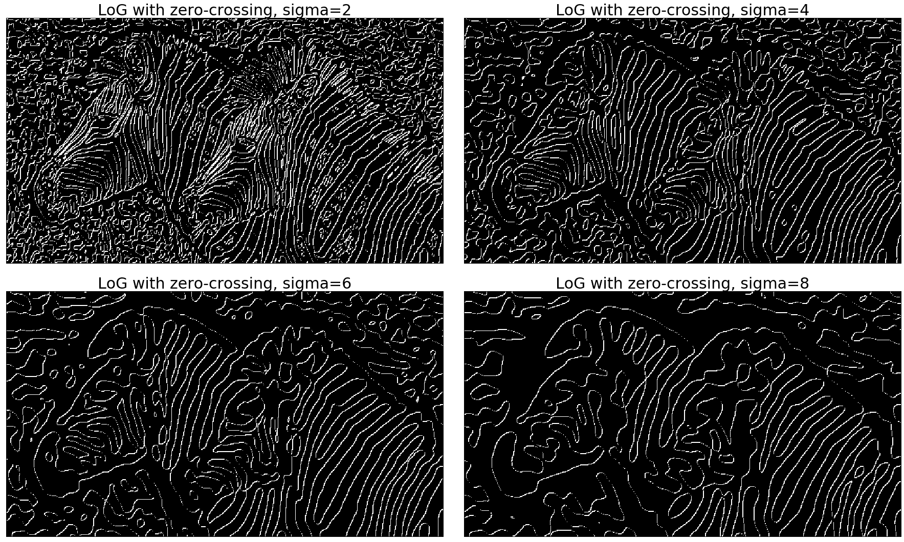 此功能的实现留作练习。以下代码块描述了通过零交叉检测到的同一斑马图像的边缘: