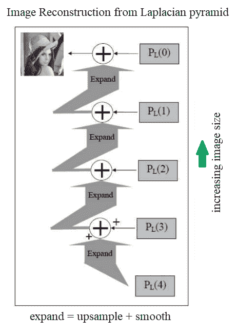 下图显示了如何仅从其拉普拉斯金字塔重建图像,如果我们按照上一节中描述的算法构造图像: