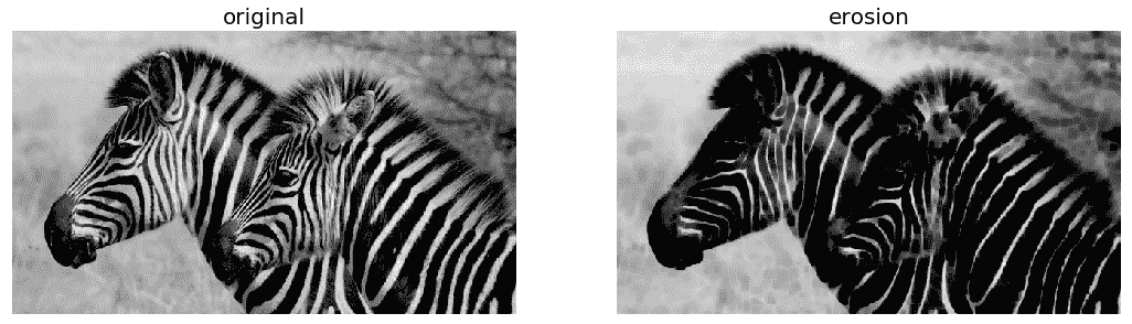 from skimage.morphology import dilation, erosion, closing, opening, squareim = imread('../images/zebras.jpg')im = rgb2gray(im)struct_elem = square(5) eroded = erosion(im, struct_elem)plot_images_horizontally(im, eroded, 'erosion')