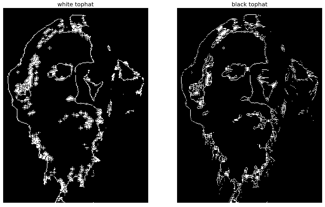 图像的白色顶帽计算出比结构元素小的亮点。它被定义为原始图像及其形态开口的差分图像。类似地,图像的黑顶帽计算出比结构元素小的黑点。定义为原始图像形态闭合图像的差分图像。原始图像中的黑点在黑顶帽操作后变为亮点。以下代码块演示如何使用 scikit imagemorphology模块函数对泰戈尔的输入二进制图像使用这两种形态学操作: