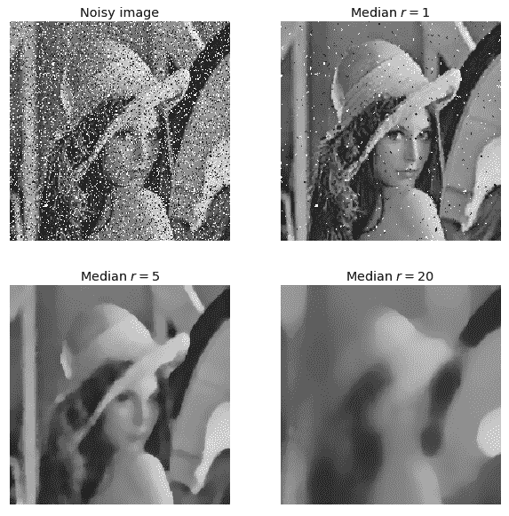 下面的代码块显示了如何使用 scikit 图像filters.rank模块的形态median过滤器。通过将 10%的像素随机设置为255(salt),将另外 10%的像素随机设置为0(胡椒),将一些脉冲噪声添加到输入灰度Lena图像中。所使用的结构元素是不同尺寸的圆盘,以便通过median过滤器消除噪音: