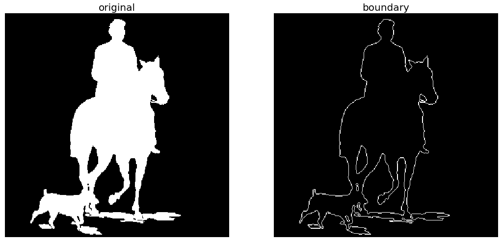 from skimage.morphology import binary_erosionim = rgb2gray(imread('../images/horse-dog.jpg'))threshold = 0.5im[im < threshold] = 0im[im >= threshold] = 1boundary = im - binary_erosion(im)plot_images_horizontally(im, boundary, 'boundary',sz=(18,9))