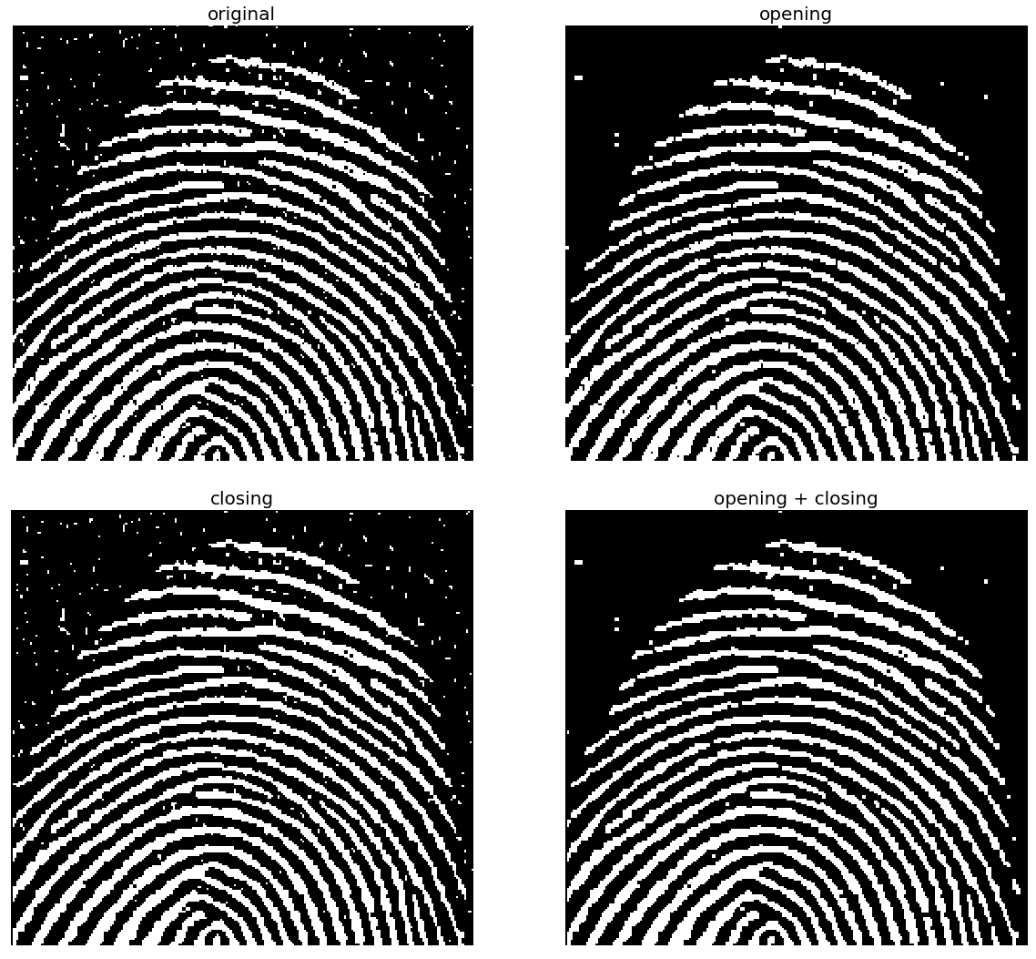 打开和关闭可顺序用于从二值图像中去除噪声(前景小对象)。这可以作为预处理步骤用于清洁指纹图像。下面的代码块演示了如何实现它: