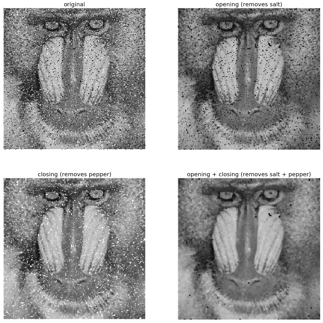 下面显示了前面代码的输出,说明了打开和关闭如何从带有噪波的曼陀罗灰度图像中移除椒盐噪声: