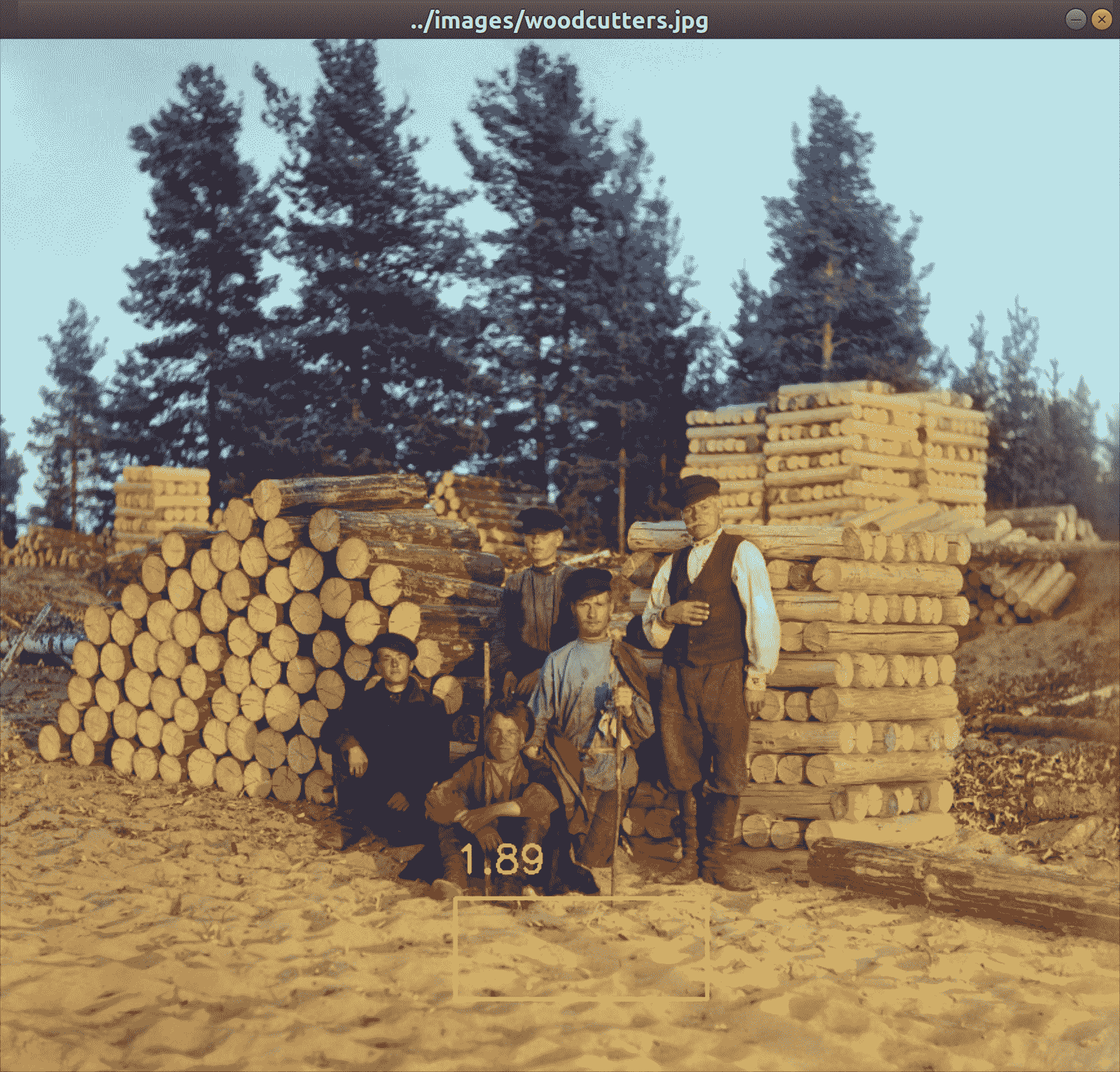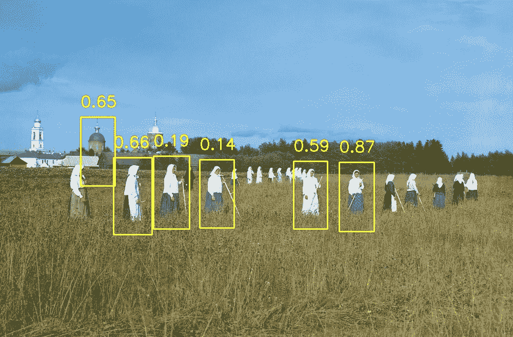 现在,我们继续加载图像(在这种情况下,是一张在干草地上工作的妇女的老照片),并尝试通过运行以下代码来检测图像中的人: