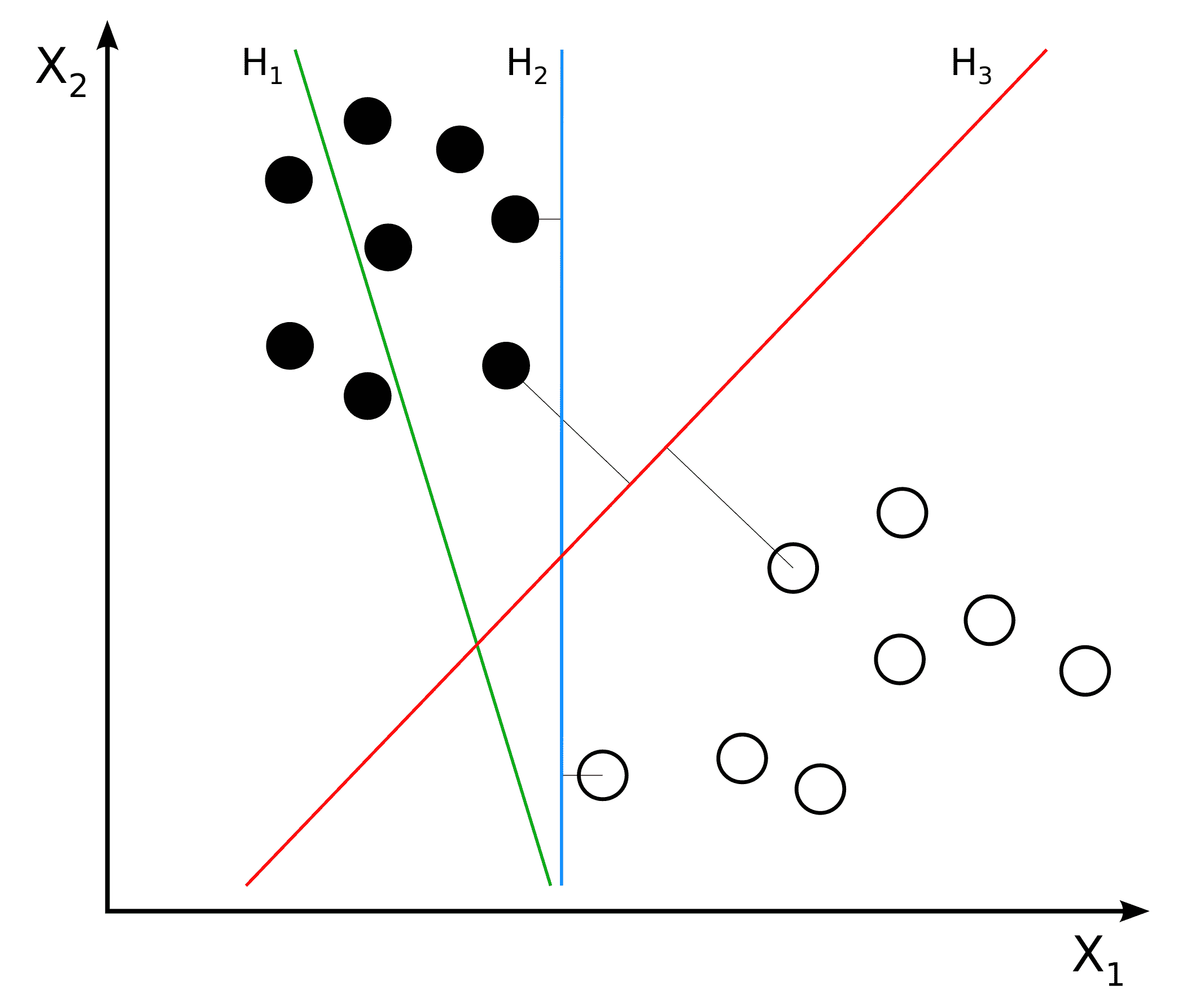 超平面H1(显示为绿线)不划分两类(黑点与白点)。 超平面H2(显示为蓝线)和H3(显示为红线)都划分了类别。 但是,只有超平面H3将类别划分为最大余量。