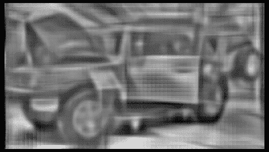 在这两种可视化中,您都可以看到 HOG 已将图像分为多个单元格,并且可以轻松识别出车轮和车辆的主要结构。 在第一个可视化中,每个单元格计算出的梯度显示为一组纵横交错的线,有时看起来像是细长的星星; 恒星的长轴代表更强的梯度。 在第二个可视化中,将梯度显示为沿单元格中各个轴的亮度平滑过渡。