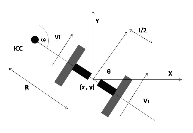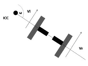 当机器人要执行转弯运动时,机器人必须绕着沿其共同的左右车轮轴的点旋转。 机器人旋转的点称为 ICC - 瞬时曲率中心。 ICC 位于机器人外部。 下图显示了差动机器人相对于其 ICC 的车轮配置: