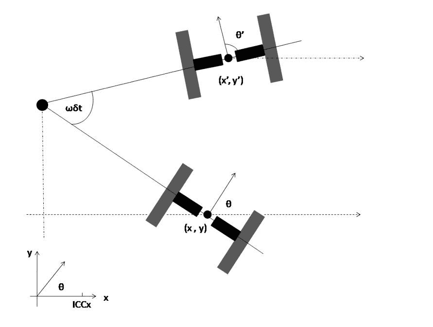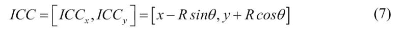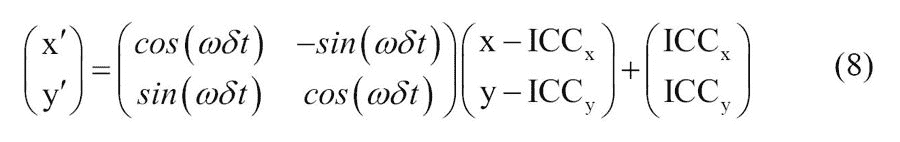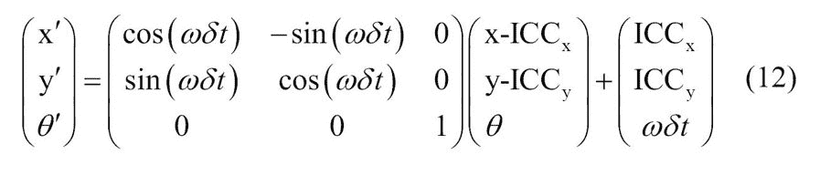 给定起始位置x, y,可以使用 2D 计算新位置x', y'。 旋转矩阵。 以δt秒的角速度ω围绕 ICC 旋转在t +δt时产生以下位置: