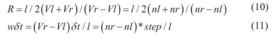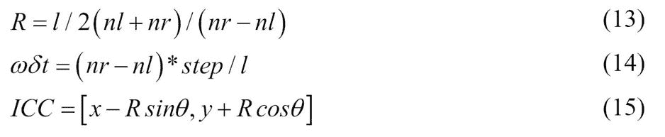 在此,nl和nr是左轮和右轮的编码器计数。Vl和Vr分别是左轮和右轮的速度。 因此,机器人站立姿势(x,y,θ)并移动nl和nr在δt的时间范围内计数; 新姿势(x',y',θ')通过以下公式得出: