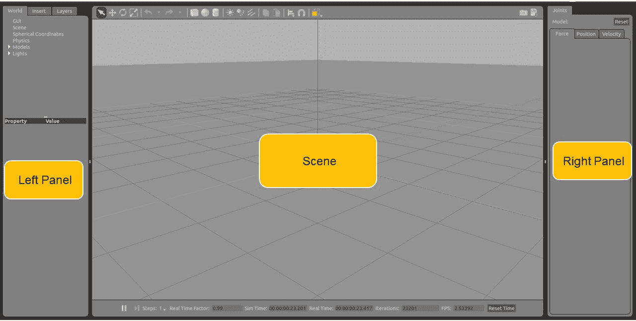 Gazebo 用户界面可分为三个部分:场景,左面板和右面板。