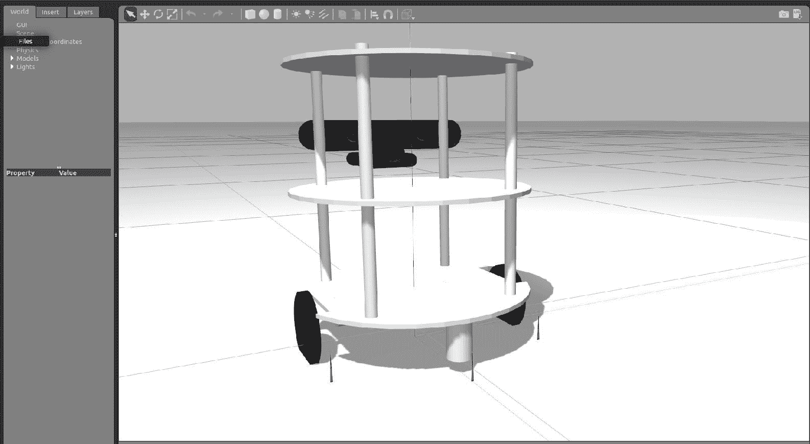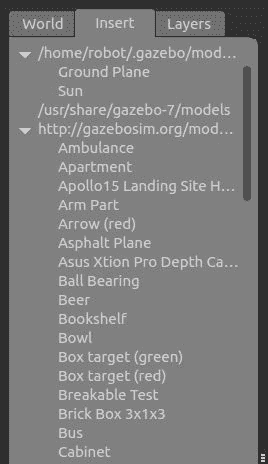 当我们启动 Gazebo 时,您会看到左侧面板。 左面板中有三个主要选项卡: