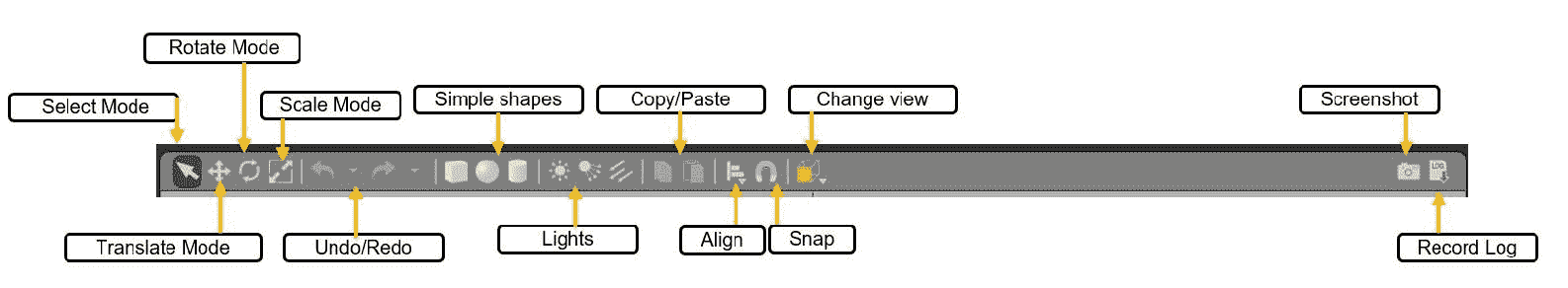 Gazebo 有两个工具栏。 一个在场景之上,另一个在场景之下。