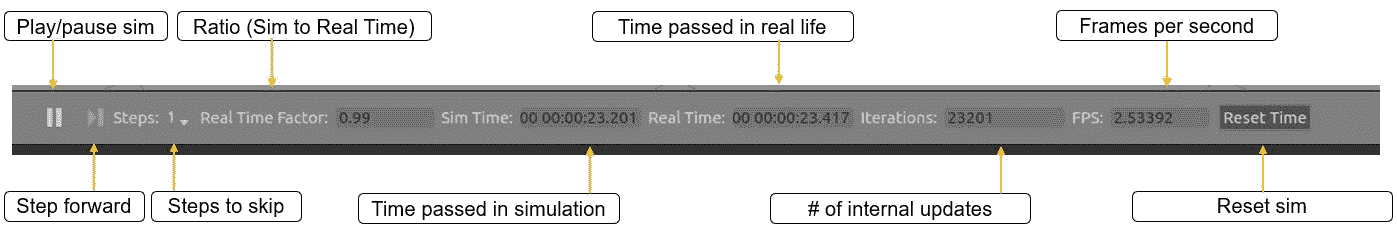 Gazebo 的世界状态可以随着每次迭代而改变。 每次迭代都可以在 Gazebo 中进行固定时间的更改。 该固定时间称为步长。 默认情况下,步长为 1 毫秒。 步长和迭代显示在工具栏中,如以下屏幕截图所示: