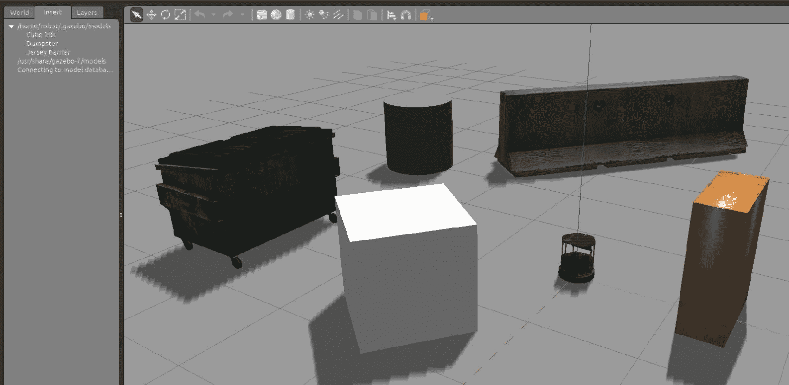 加载模拟将花费一些时间,并且在加载时,您会在 Gazebo 场景中看到以下模型: