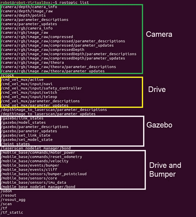 如前所述,我们可以从差动驱动器插件,深度传感器和保险杠开关中看到主题。 除此之外,我们还可以从 ROS-Gazebo 插件中看到主题,这些主题主要包含机器人的当前状态以及仿真中的其他模型。