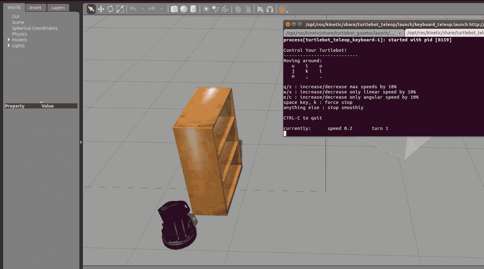 机器人的差分驱动器插件能够接收 ROS 扭曲消息(geometry_msgs/Twist),该消息包括机器人当前的线速度和角速度。 机器人的遥控意味着通过操纵杆或键盘使用 ROS Twist 消息手动移动机器人。 现在,我们将研究如何使用键盘遥控操作移动 Turtlebot 2 机器人。